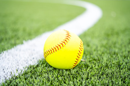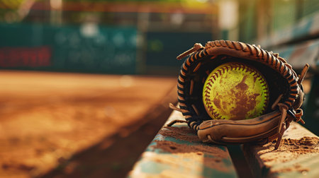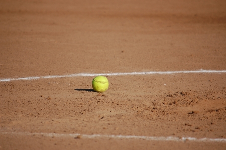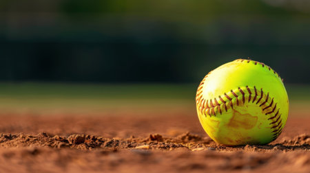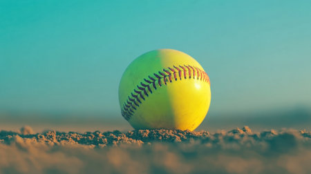 A vibrant yellow softball rests on the dirt field, illuminated by soft natural light, capturing the essence of outdoor sports and teamwork.