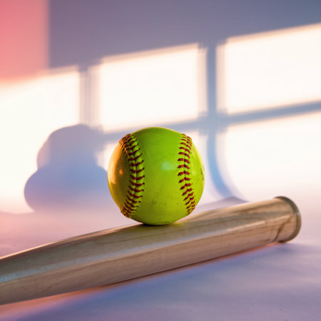 A bright yellow softball rests on a wooden bat, showcasing its vibrant color in soft light.