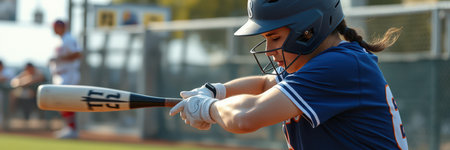 Young female athlete swings bat during softball practice on sunny field in afternoon light