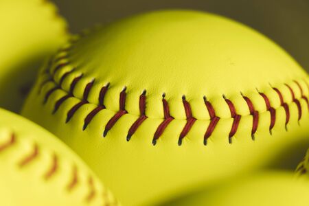 Old softball gloves and old softball balls on the homepage in a softball field.