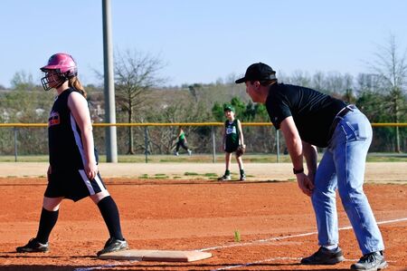 Cumming, GA, USA - March 31, 2010 - First base coach watching the runners in Forsyth County, Cumming, GA, March 31, 2010, the Coal Mountain Lady Bulldogs vs the Central Green Vipers.