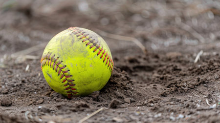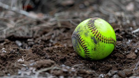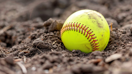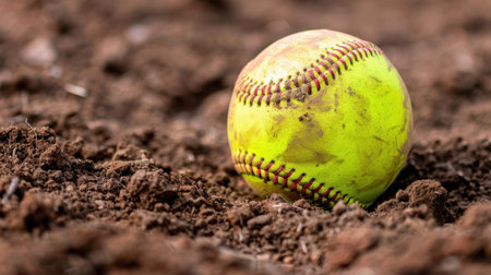 A close-up of a muddy softball resting on the infield dirt The ball is in focus, while the background is blurred The photo captures the excitement and intensity of a softball game AI Generative