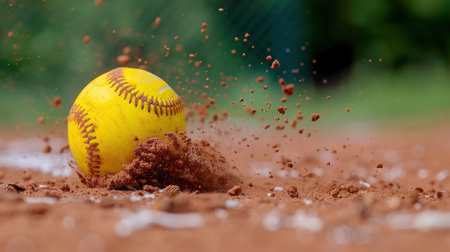 A bright yellow softball bounces on a rich brown dirt field, creating a cloud of dust and capturing the dynamic action of the game perfect for sports imagery.
