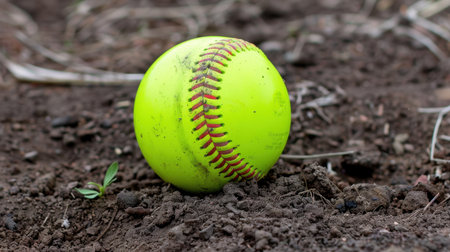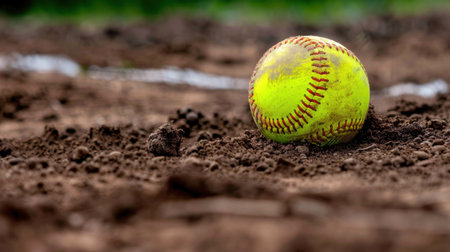A bright yellow softball rests on rich brown soil, capturing the essence of outdoor sports. The dynamic imagery evokes feelings of competition and playfulness.