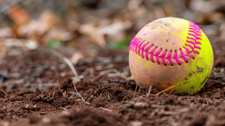 A vibrant yellow softball with pink stitching rests on brown earthy ground, capturing the essence of outdoor sports and recreational play. Perfect for sports-related themes.