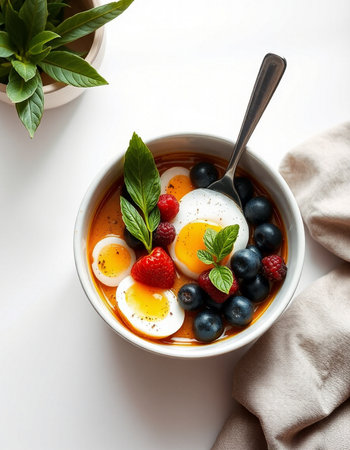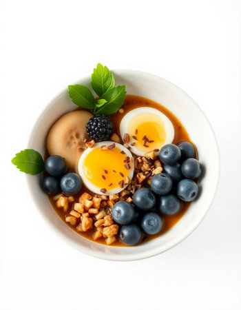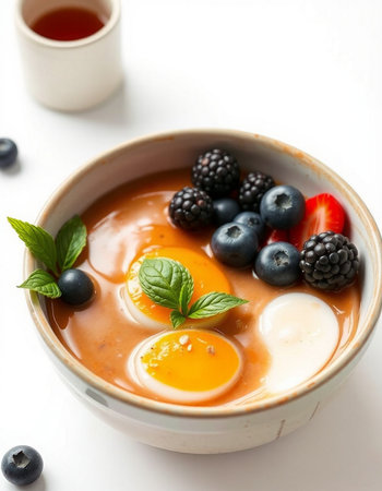 Soft-boiled egg in tomato sauce with blueberries and mint