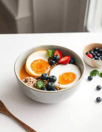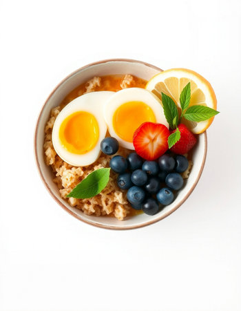 Healthy breakfast bowl with oatmeal, strawberries, blueberries and eggs