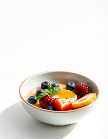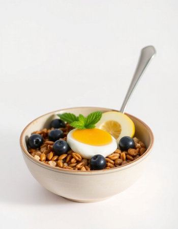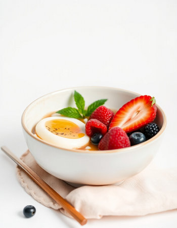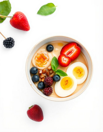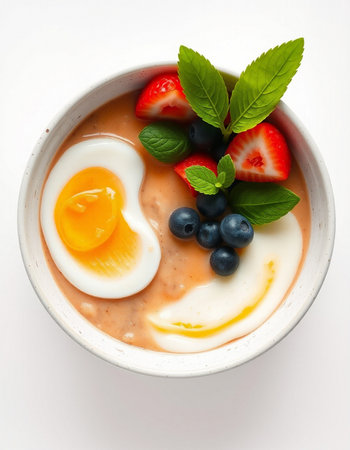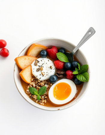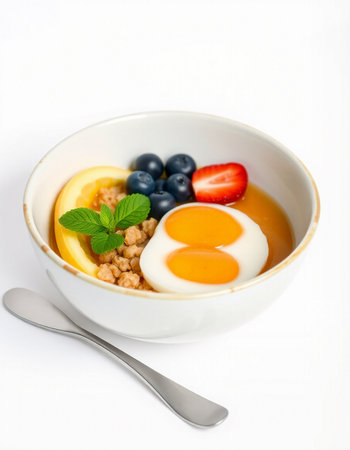 Bowl of healthy breakfast with fresh berries and egg on white background