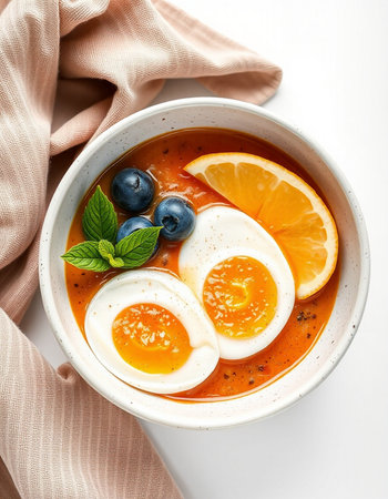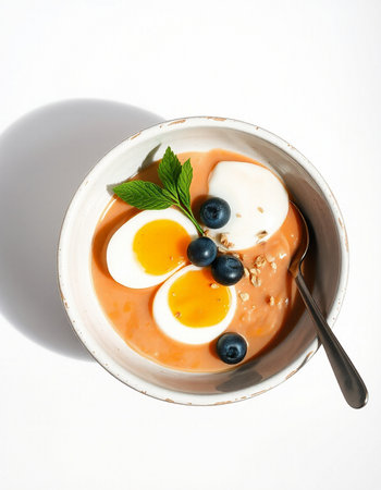 Tomato soup with blueberries and soft-boiled eggs, top view