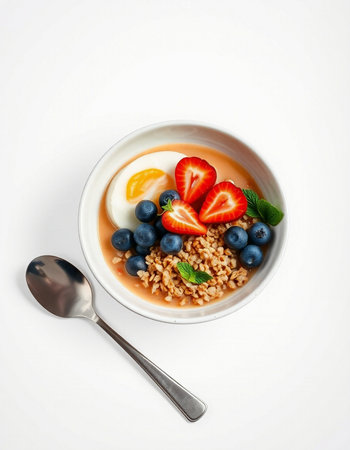 Healthy breakfast bowl with oatmeal, berries and yogurt on white background