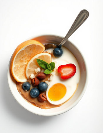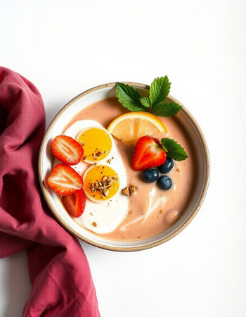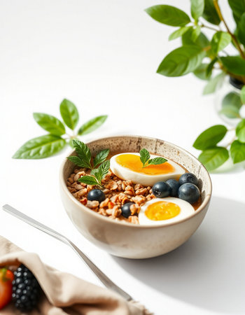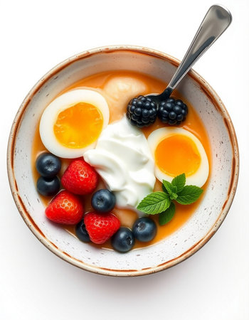 Healthy breakfast bowl with yogurt, berries and eggs on white background