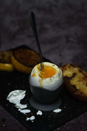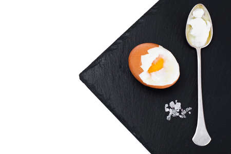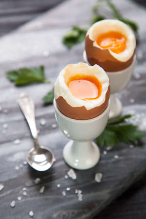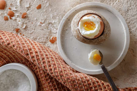 Perfect soft boiled egg for delicious breakfast on a table. Traditional homemade food. Top view.