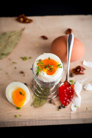 boiled egg for breakfast, on a wooden board.