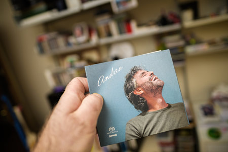 Paris, France - Feb 29, 2024: A male hand holds an Andrea Bocelli SACD with sleeves, set against a backdrop of music records, highlighting a focus on the artist and musical collection