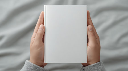 A serene image featuring hands gracefully holding a blank book with a white cover against a soft gray background, perfect for various creative projects or inspirations.