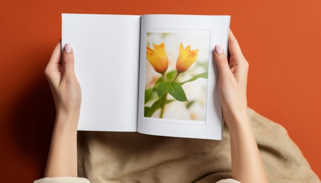 beautiful female hands holding white magazine with blank cover mock up at home