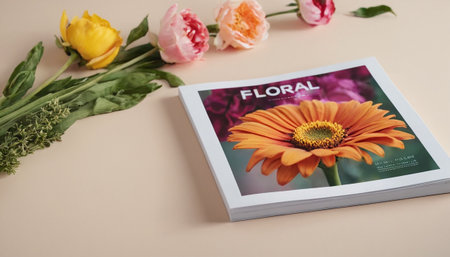floral magazine with flowers on beige background, top view.