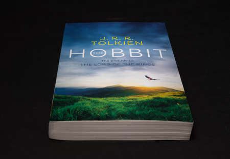 Galle, Sri Lanka - 04 07 2021:The Hobbit by J R R Tolkien, World famous Lord of the rings prelude novel book lay flat in the darkroom tabletop. Fantasy fiction novel book for kids.