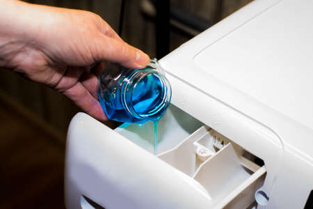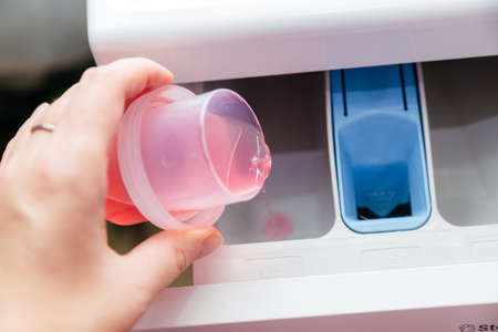 Woman's hand pouring liquid detergent in lid with washing machine in background