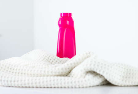 Laundry detergent bottles and clothes on the table. Household chemicals