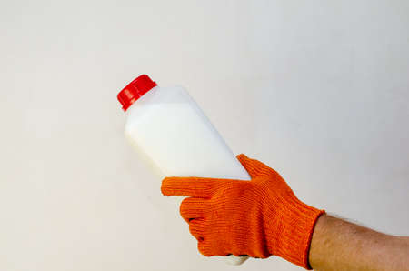 A hand in a red protective glove holds a plastic container against a light background. A mans hand with a white rectangular bottle against the wall. Paint or wall primer. Painting services. Indoors.