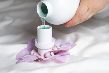 The process of pouring natural eco gel liquid laundry detergent from the bottle into the cap
