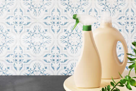 Mock up of natural cleaning products. Two bottles of natural detergents for house cleaning on a wooden board in the kitchen. Eco friendly cleaning. Soft image and soft focus style