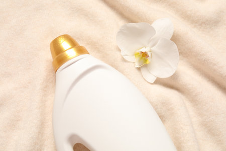 Bottle of fabric softener and orchid flower on soft cloth, flat lay