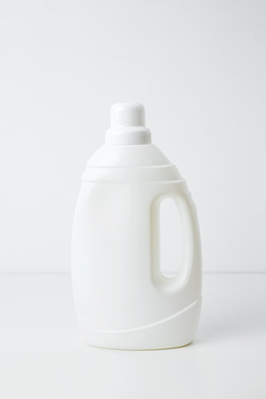 Detergent bottle on blue background. Plastic container of cleaning product, household chemicals or liquid laundry detergent. Laundry day, cleaning concept
