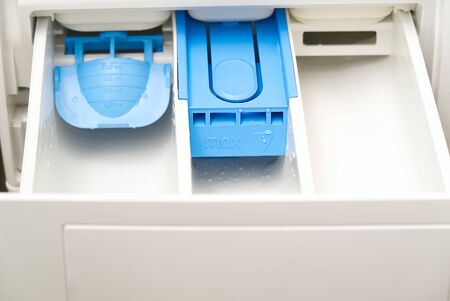 Washing machine dispenser. Tray for washing powder in the washing machine. close up