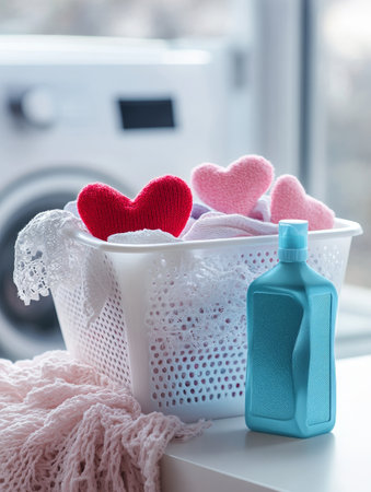 sleek bottle on a pristine white marble counter, framed by a colorful laundry basket and a washing machine in the background.
