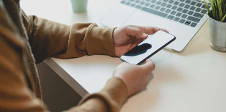 Top view close up of a man using mobile smart phone, mock up display