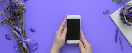 Overhead shot of a woman holding smartphone on purple table with notebook and flowers