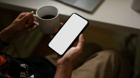 Cropped shot of female freelancer using mock-up smartphone to contact customer and drinking hot coffee on white table