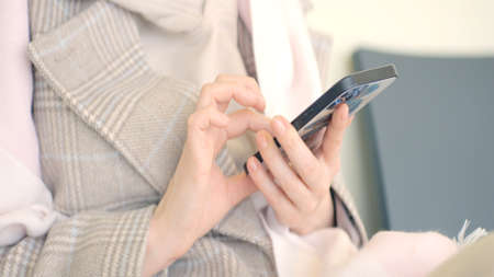 Cropped shot view of woman hands holding smart phone with blank copy space screen for your text message or information content, female reading text message on cell telephone during in urban setting.