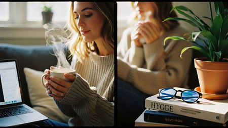 Collage of young woman sitting on sofa at home, drinking coffee and reading book