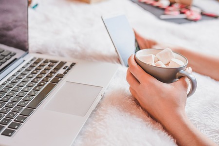 woman drinking coffee at home in her bed while checking her laptop