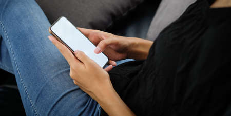 Woman use of mobile phone and sit on sofa at home