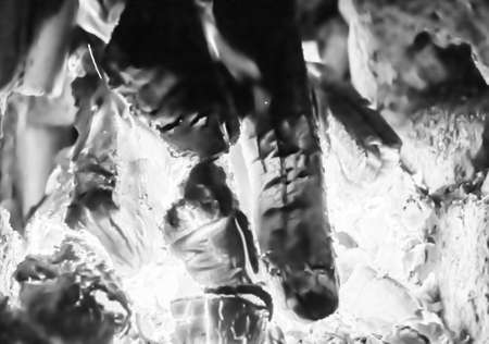 A close-up, black and white image of a pile of charcoal briquettes on ash. Clear details and vibrant colors en...