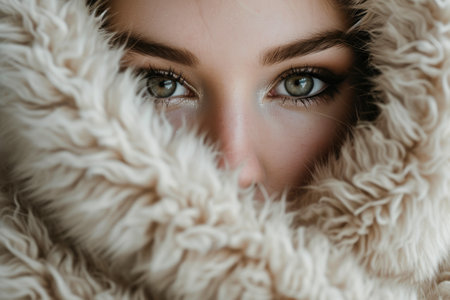 A stunning close-up portrait of a young woman showcasing her captivating blue eyes and natural beauty while wearing a luxurious fur hood. The serenely neutral background enhances the warm and cozy feel of the image, perfect for winter-themed projects.