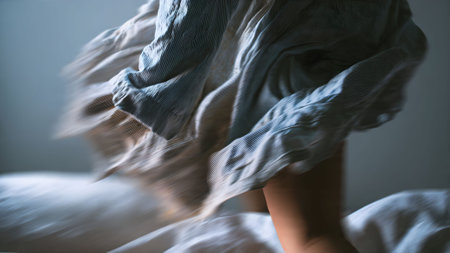Woman jumping on bed in bedroom. Happy and carefree young woman having fun at home. Motion blur.