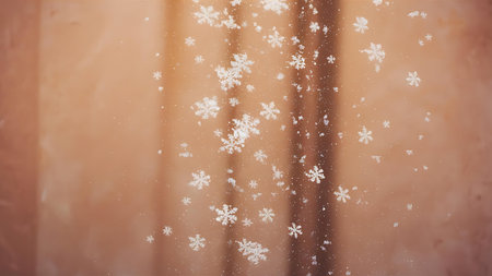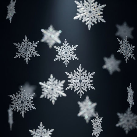 A serene and magical scene of snowflakes gently falling against a dark background, creating a peaceful and enchanting atmosphere.