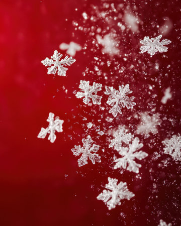 Falling snowflakes against a bright red background with soft frosty details.
