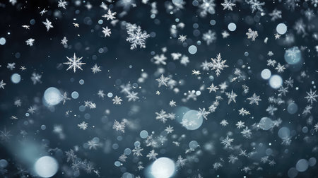A mesmerizing scene showcasing delicate snowflakes gracefully falling against a dark backdrop, enhanced by beautiful bokeh lights, creating a magical winter atmosphere.