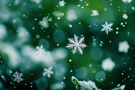 Snowflakes falling against a vivid green background creating a beautiful winter scene