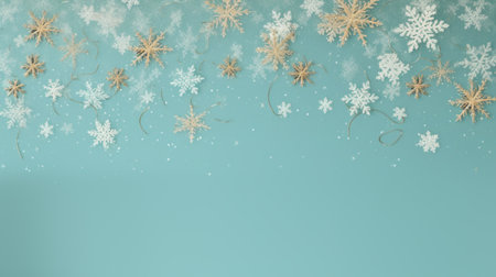 snowflakes on blue wall with light gold and aquamarine style. matte background made of organic material in light turquoise and light beige. flowing brushwork and delicate paper cutouts in dark green and light gold. ai generated