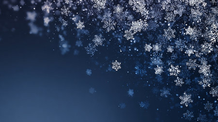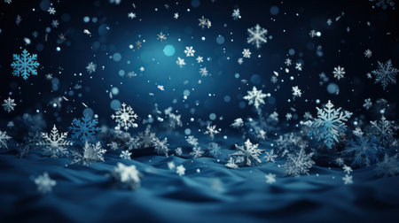 Delicate snowflakes fall and scatter against a dark blue backdrop, evoking a tranquil winter ambiance perfect for seasonal themes.