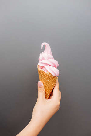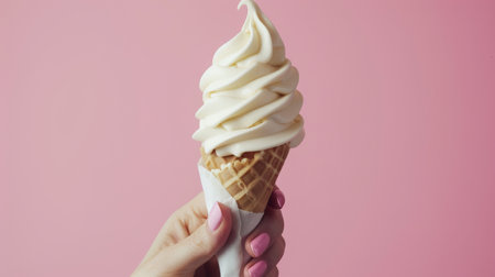 Hand holding vanilla ice cream cone against pink background, close-up. Sweet dessert and summer treat concept
