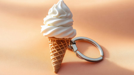 A charming keychain featuring a miniature ice cream cone topped with swirled soft serve. Perfect for adding a playful touch to any collection or as a unique gift.