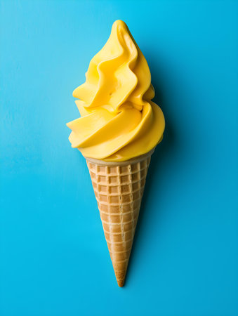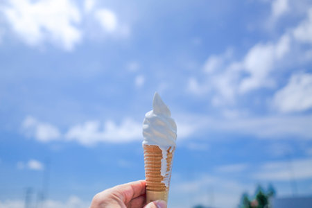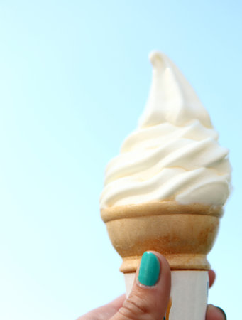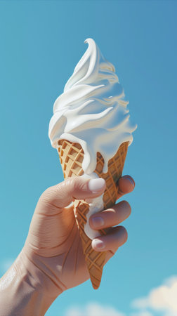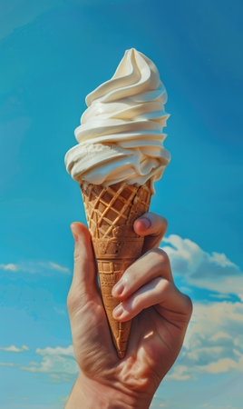 A charming ice cream cone features creamy vanilla ice cream, set against a beautiful blue sky. Perfect for evoking summer enjoyment and outdoor fun.